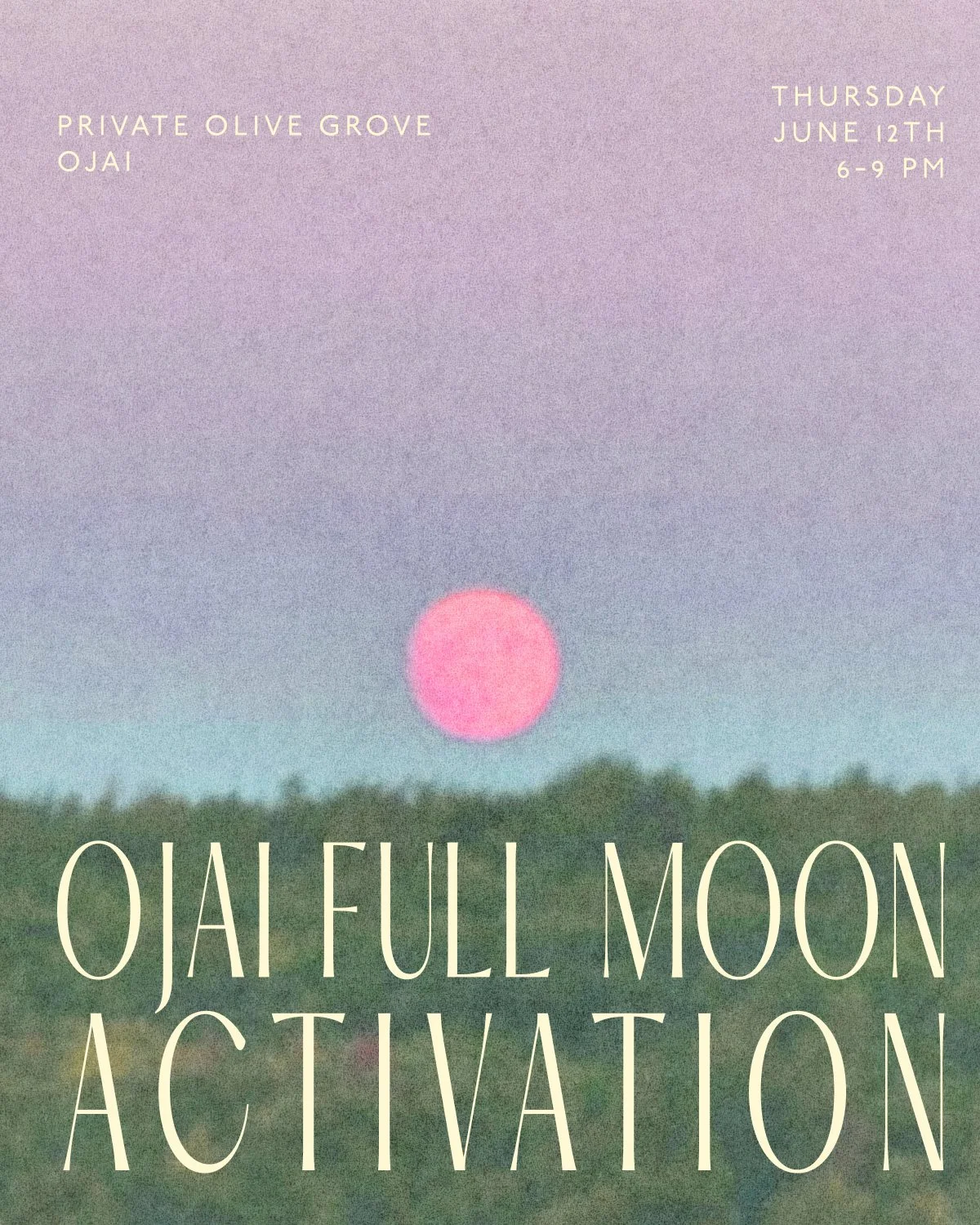 Join PALMA Colectiva for a Strawberry Full Moon Activation at a private Olive Grove in Ojai. This Sagittarius Full Moon invites introspection and personal growth. The event begins with intention setting and a mindful eating workshop with Integrative Nutritionist Marleny Asquith. Experience the heart-opening gift of Cacao, followed by a nature walk and sunset hike. We'll gather at a special spot to enjoy the sunset and full moon, allowing for reflection. The evening concludes with sound healing by Kelly Jean Anderson and a Fire Circle for releasing written prayers. All set-up included.